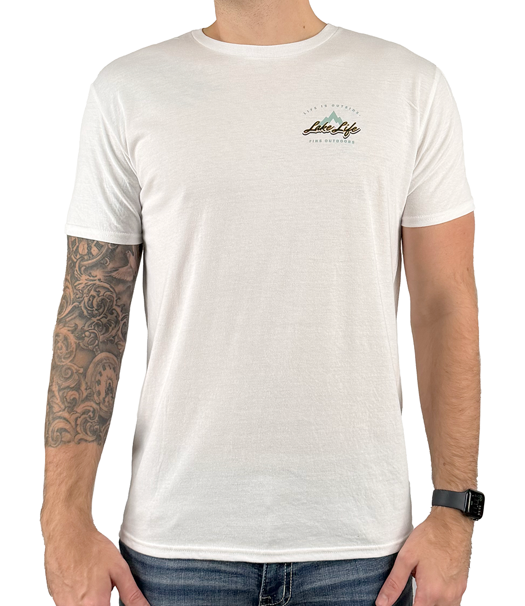 The Lake Life Tee! The Fins Outdoors Blended Bottle Tee is made from 60% cotton and 40% recycled polyester from post consumer plastic bottles pulled from the waterways and landfills.